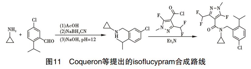 Ceciliano、Dahmen、Coqueron等提出了相似的isoflucypram路线,以环丙烷胺、5-氯-2-异丙基苯甲醛为中间体,卤代物与胺基反应得N-(2-异丙基-5-甲基苄基)环丙烷胺,所得仲胺中间体与3-(二氟甲基)-5-氟-1-甲基-1H-吡唑-4-酰氯反应即得产品,路线见图11。