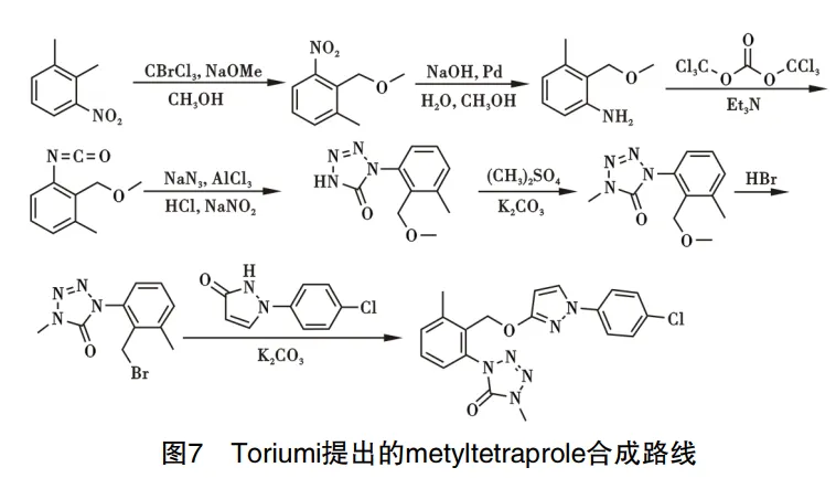 Metyltetraprole由日本住友公司研发[10],用于防治壳 针孢属引起的病害。反应以1,2-二甲基-3-硝基苯为原 料,经氧化得2-(甲氧甲基)-1-甲基-3-硝基苯,所得产物经过还原得2-(甲氧甲基)-3-甲基苯胺,所得苯胺产物在光气作用下生成异氰酸酯,在叠氮化钠作用下发生环化反应得到产物1-(2-(甲氧基甲基)-3-甲基苯基)-1,4-二氢-5H-四唑-5-酮,环化产物在硫酸二酯的参与下发生 甲基化反应,得到1-(2-(甲氧基甲基)-3-甲基苯基)-4-甲基-1,4-二氢-5H-四唑-5-酮,甲基化产物与氢溴酸发生溴代反应,溴代产物与1-(4-氯苯基)-1,2-二氢-3H -吡 唑-3-酮反应得到产物metyltetraprole,路线见图7。