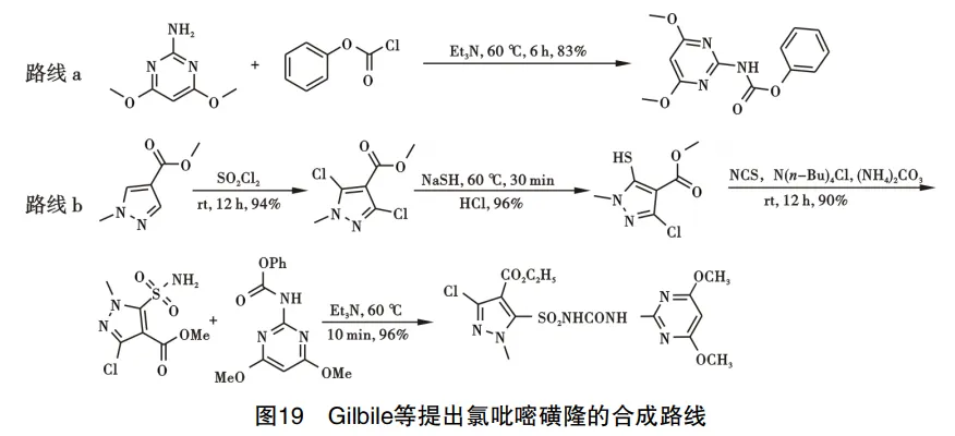2017年,Gilbile等提出制备氯吡嘧磺隆的汇聚式合成路线,分别由2条路线得到关键中间体后,在通过中间体的酰化对接得到产物。路线a:由4,6-二甲氧基-2-嘧 啶胺、氯甲酸苯基酯为原料,三乙胺为缚酸剂,得到2-苯氧羰基氨基-4,6-二甲氧基嘧啶;路线b:由初始原料1-甲 基吡唑-4-羧酸甲酯与二氯亚砜反应得到二氯取代中间体,然后通过与硫氢化钠反应得到巯基取代中间体,与1-氯-2,5-吡咯烷二酮反应得到3-氯-1-甲基-5-氨磺酰 基-1H-吡唑-4-羧酸甲酯,再与2-苯氧羰基氨基-4,6-二甲氧基嘧啶发生酰化反应得到氯吡嘧磺隆,路线见图19。