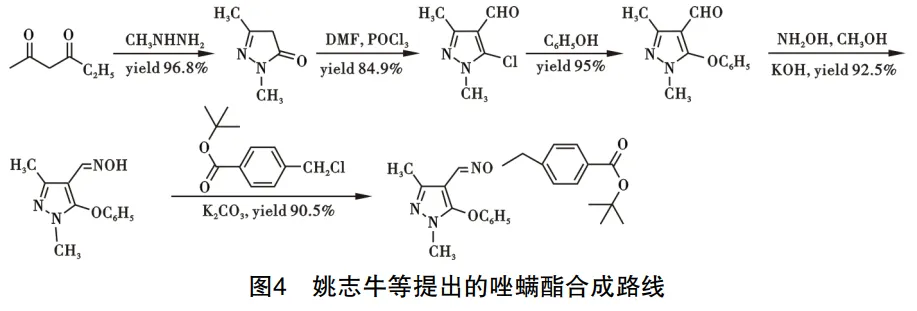 肟醚吡唑类的代表品种是唑螨酯(fenpyroximate),该类药物的作用机理是抑制NADH-辅酶Q还原酶,减少ATP的生成,还可以抑制螨卵发育以及幼虫向成虫的转化。其中,唑螨酯主要用于防治小菜蛾、稻飞虱对作物的危害。姚志牛等[6]提出唑螨酯的制备路线,该路线以乙酰乙酸乙酯和甲基肼为起始原料,在乙醇中进行环合反应,得到中间体1,3-二甲基-1H-吡唑-5-酮,再与三氯氧化磷和N,N- 二甲基甲酰胺制备的维尔斯-迈尔试剂反应,生成5-氯-1,3-二甲基-1H -吡唑-4-醛,然后与苯酚进行醚化反应得到1,3-二甲基-5-苯氧基-1H -吡唑-4-醛,在碱性条件下与盐酸羟胺反应得到1,3-二甲基-5-苯氧基-1H-吡唑-4-醛肟,最后与对氯甲基苯甲酸叔丁酯进行缩合反应得到唑螨酯,路线见图4。