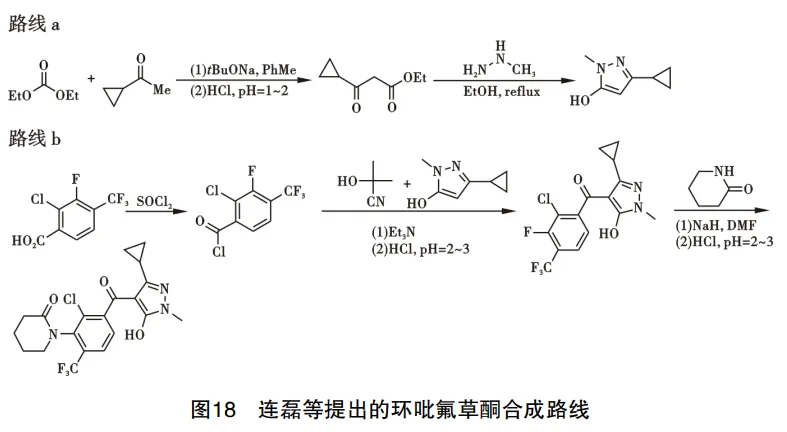 最近,连磊等提出了环吡氟草酮的汇聚式合成路线,分别从2条路线出发得到吡唑中间体和苯甲酸中间体,2者再进行酰化反应对接得到最终产物。路线a:制备3-环丙基-1-甲基-1H-吡唑-5-醇,以碳酸二乙酯为起始原料制备3-环丙基-3-氧代丙酸乙酯,所得产物与甲基肼发生环化反应,得到中间体3-环丙基-1-甲基-1H -吡唑-5-醇;路线b:制备目标产物环吡氟草酮,以2-氯-3-氟-4-(三氟甲基)苯甲酸为原料,与氯化亚砜反应生成酰氯,再与路线a得到的中间体3-环丙基-1-甲基-1H-吡唑-5-醇发生酰化反应,得到(2-氯-3-甲基-4-(三氟甲基)苯基)(3-环丙基-5-羟基-1-甲基-1H-吡唑-4-基)甲酮,最终在氢化钠作用下与哌啶酮反应得到产物环吡氟草酮,路线见图18。