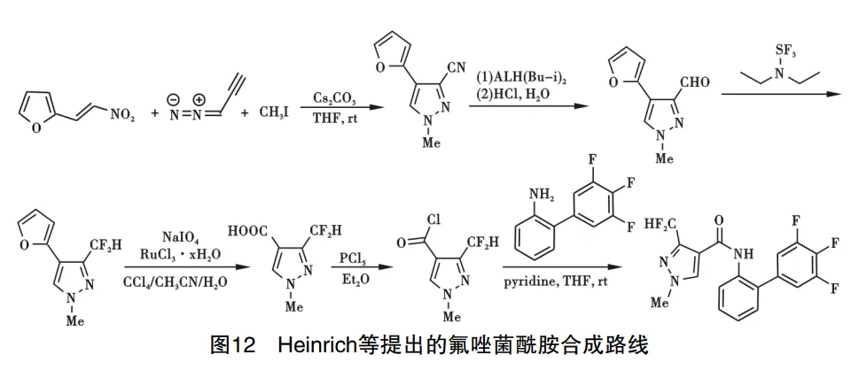 Heinrich、Zhang等提出了相似的氟唑菌酰胺制备路线,以(E)-2-(2-硝基乙烯基)呋喃、2-(二氮烯基)乙腈为初始原料在碳酸铯催化下发生关环反应,再通过氢化铝还原氰基得到羰基,在N,N-二乙基-1,1,1-三氟甲基胺亲电进攻下得到3-(二氟甲基)-4-(呋喃-2-基)-1-甲基-1H-吡唑,在高碘化钠氧化下将呋喃基团被氧化成羧基,通过五氯化磷发生氯代反应,所得氯代物与3忆,4忆,5忆-三氟-[1,1忆-联苯]-3-胺反应即得产物氟唑菌酰胺,路线见图12。