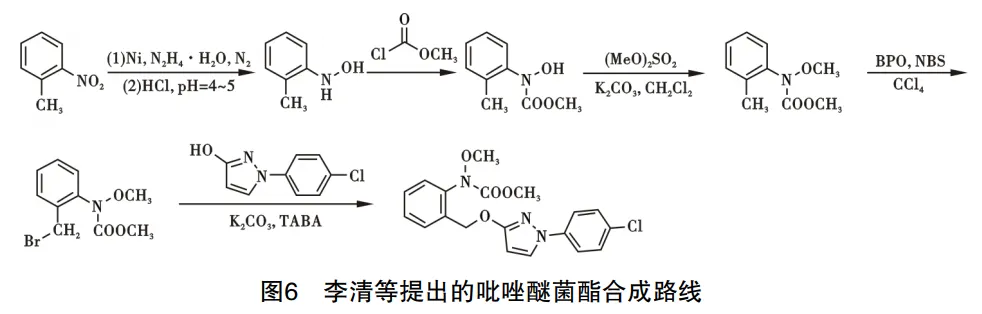 吡唑醚菌酯(pyraclostrobin)由德国巴斯夫公司研发上市,能防治由子囊纲、担子菌纲、半知菌类和卵菌纲等几乎所有类型的真菌病原体引起的植物病害,同时它又是一种激素型杀菌剂,能使作物吸收更多的氮元素,促进作物的生长。李清等[9]提出制备吡唑醚菌酯的路线,以邻硝基甲苯为原料,经过还原、酰化、烷基化、溴化后再与1-(4-氯苯基)-3-吡唑醇反应生成目标化合物吡唑醚菌酯,路线见图6。