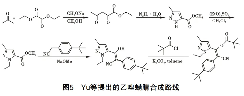 2016年,Yu等提出乙唑螨腈的制备路线,以草酸二乙酯为原料,在甲醇钠碱性作用下与丙酮发生亲核反应,所得中间体与水合肼关环反应得到 5-甲基-1H-吡唑-3-羧酸甲酯;在硫酸二乙酯参与下,发生烷基化反应得到1-乙基-3-甲基-1H-吡 唑-5- 羧酸甲酯;所得中间体在甲醇钠碱性条件下被对叔丁基苯乙腈亲核进攻得到中间体(Z)-2-(4-(叔丁基)苯基)-3-(1乙基-3-甲基-1H-吡唑)-3-羟基丙烯腈,再与新戊酰氯反应即得到产物乙唑螨腈,路线见图5。