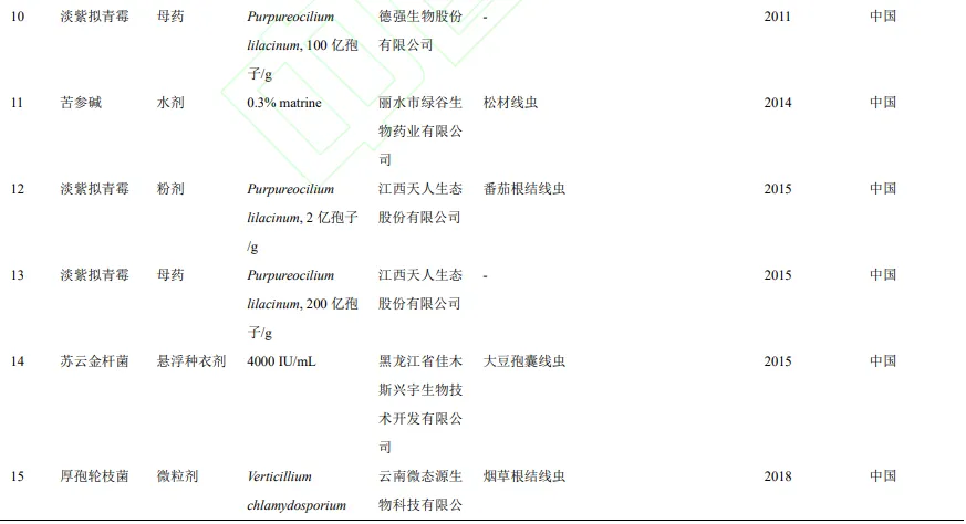 2009年福建凯立生物制品有限公司也登记了“淡紫拟青霉”,用于防治番茄根结线虫。2014年,浙江丽水市绿谷生物药业有限公司登记了第一个植物源生物杀线剂“苦参碱”,防治松树的松材线虫。2015年,黑龙江省佳木斯兴宇生物技术开发有限公司登记了细菌源杀线剂“苏云金杆菌”,防治大豆孢囊线虫。2019年,长沙艾格里生物科技有限公司登记了杀菌剂“嗜硫小红卵菌HNI-1”,可以防治番茄根结线虫(表2)。