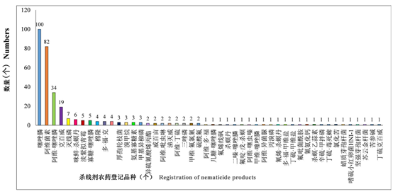 截至2020年5月31日,我国杀线剂农药登记共323项,分为48种,化学杀线剂31种,占杀线剂种类的64.58%;生物杀线剂8种(苦参碱,淡紫拟青霉,氨基寡糖素,厚孢轮枝菌,嗜硫小红卵菌HNI-1,坚强芽胞杆菌,苏云金杆菌,腊质芽胞杆菌),占16.67%;农用抗生素9种(阿维菌素及其复配产品),占18.75%。数量方面,噻唑膦第一(100),阿维菌素第二(82),阿维·噻唑膦第三(34)。截至2019年7月31日,全国杀线剂农药登记共308项,分为46种,化学杀线剂29种,占杀线剂种类的63.04%;生物杀线剂8种(苦参碱,淡紫拟青霉,氨基寡糖素,厚孢轮枝菌,嗜硫小红卵菌,坚强芽孢杆菌,苏云金杆菌,蜡质芽孢杆菌),占17.39%;农用抗生素9种(阿维菌素及其复配产品),占19.57%。数量方面,噻唑膦第一(98),阿维菌素第二(77),阿维·噻唑膦(31)。与2019年比,2020年的杀线剂农药登记总数量增加了15项,新种类增加了2种(溴甲烷和阿维·噻虫嗪)。生物杀线剂虽无新增种类,但有几个产品被登记为杀菌剂如氨基寡糖素、嗜硫小红卵菌HNI-1,坚强芽孢杆菌,腊质芽孢杆菌。登记数量方面,产品顺序没变,依然是噻唑膦第一,阿维菌素第二,阿维·噻唑膦第三[6](图1)。