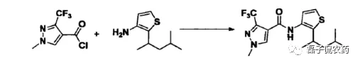 根据文献报道,吡噻菌胺的合成主要有两种方法,第一种方法是分别合成1-甲基-3-三氟甲基-1H-吡唑-4-甲酰氯和中间体2-(4-甲基戊基-2-甲基)-3-氨基噻吩,然后这两个中间体再反应生成吡噻菌胺。
