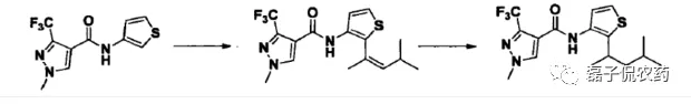 第二种方法是首先合成中间体N-(3-噻吩)-1-甲基-3-三氟甲基-1H-吡唑-4-甲酰胺,然后再与甲基异丁基甲酮反应,最后用氢气还原双键得到吡噻菌胺。