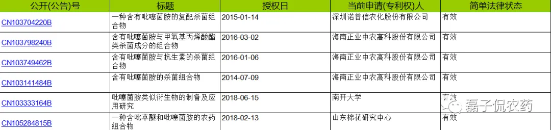 截止2020年8月9日,我国已有吡噻菌胺相关生效的专利仅6件,大多为复配相关专利。
