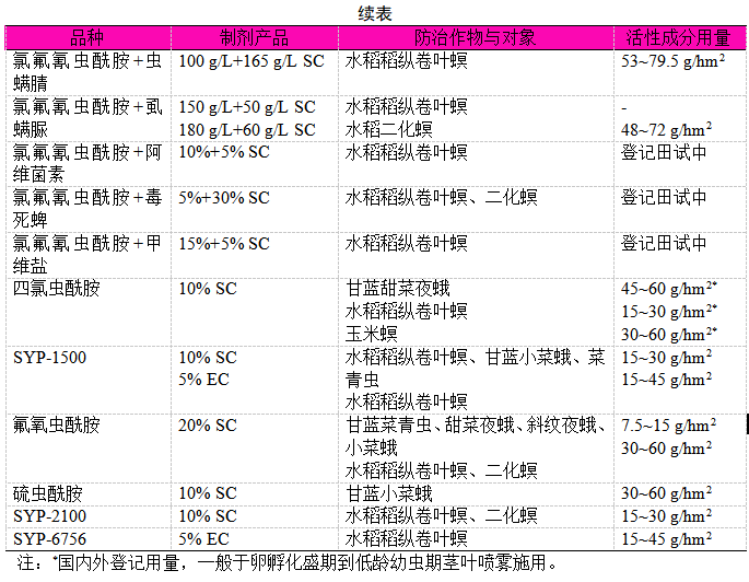 邻甲酰氨基苯甲酰胺类杀虫剂创制品种对稻纵卷叶螟、二化螟、大螟、小菜蛾、菜青虫、斜纹夜蛾、甜菜夜蛾、黏虫、棉铃虫和玉米螟等鳞翅目害虫的杀虫活性和/或田间防效多优于氯虫苯甲酰胺或与之相当。在低浓度时,硫虫酰胺(0.25 mg/L)对甜菜夜蛾,丁氯虫酰胺(0.016 mg/L)对棉铃虫和玉米螟仍具有优异的防除效果。对小菜蛾和甜菜夜蛾等靶标鳞翅目害虫的杀虫活性,SYP-1500 > SYP-6756 > SYP-6759。