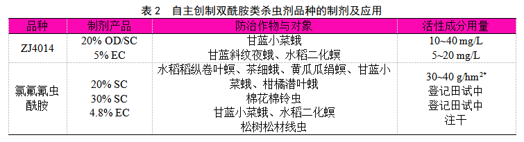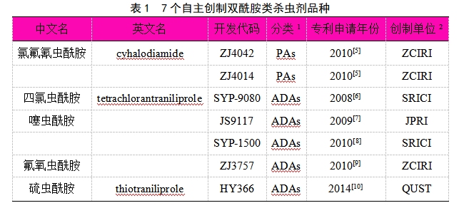 注:1 分类:自主创制的双酰胺类杀虫剂品种按化学结构可细分为两小类:邻苯二甲酰胺类(phthalamides, PAs)和邻甲酰氨基苯甲酰胺类(anthranilic diamides, ADAs)。2 创制单位:ZCIRI——浙江化工研究院有限公司,SRICI——沈阳化工研究院有限公司,JPRI——江苏省农药研究所有限公司,QUST——青岛科技大学。