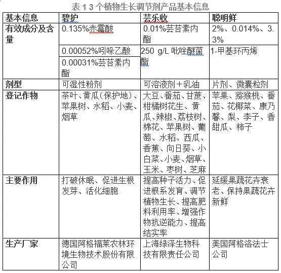 同农药产品类似,植物生长调节剂产品一般也包括有效成分名称、有效成分含量、剂型等要素。植物生长调节剂及产品创新可以从不同有效成分复配使用、环保剂型开发、高效助剂应用等多个角度实现。以下简单分析3个市场上应用广泛的植物生长调节剂产品创新案例(见表1)。