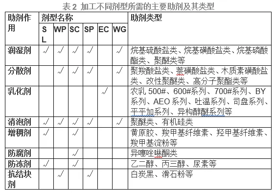 从登记数据可以看出:植物生长调节剂产品多加工成水剂、可湿性粉剂、悬浮剂、可溶液剂、可溶粉剂、乳油、水分散粒剂等常规剂型。不同剂型加工时所需添加的关键助剂及其类型见表2。