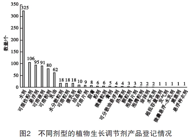 其次为可湿性粉剂、悬浮剂、可溶液剂、可溶粉剂等(见图2)。植物生长调节剂产品登记的可溶性剂型较多,如水剂、可溶液剂、可溶粉剂、可溶粒剂、可溶片剂等,其原因大致有2个方面: