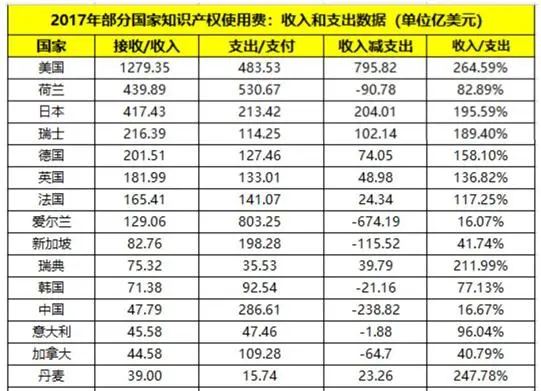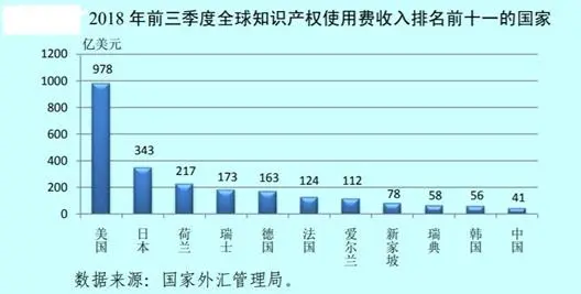 2017年,中国对外支付的知识产权使用费逆差超过200亿美元(约合人民币1265亿元),而美国每年对外许可知识产权净收入接近800亿美元(约合人民币5059亿元);