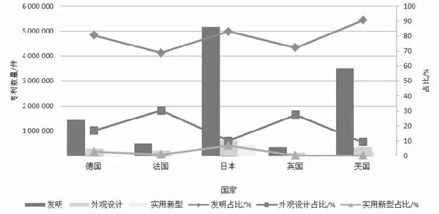 据中国专利数据统计及分析公司patsnap智慧芽对于1978到2017年间美国、英国、日本、法国和德国的专利申请类的统计分析显示,美国申请专利中90.43%的为发明专利,发明专利占比英国为 72.27%、日本为82.92%、法国为 68.81%、德国为80.5%;而我国申请专利中发明专利仅占35.53%(最高时也未能达到40%),且无效专利占所有专利的48.75%(接近一半)。