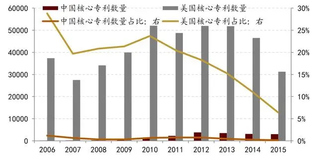 中国核心专利数量比例远远低于美国的核心专利数量占比比例