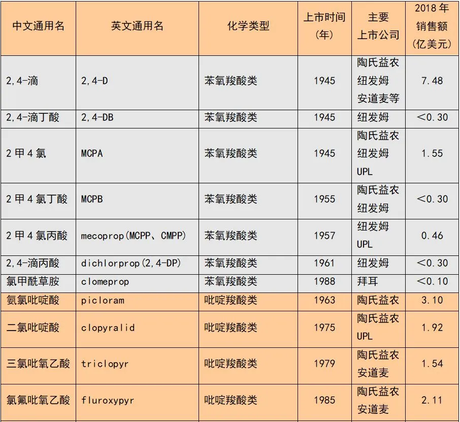 表1 合成激素类除草剂的分类(不完全统计)及2018年销售额