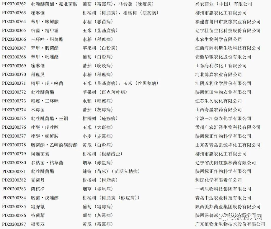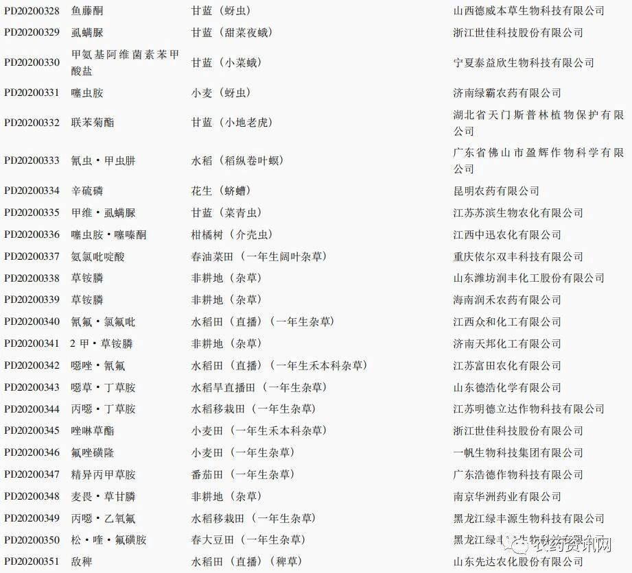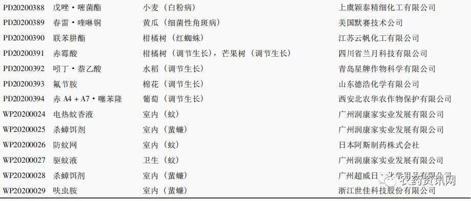 2020年5月农业农村部批准农药产品登记情况:共批准农药登记1,633个,其中新批准登记101个,登记延续1,532个。新批准农药登记中没有新有效成分,包括95个大田用农药产品,6个卫生用农药产品。新批准登记产品如表1。
