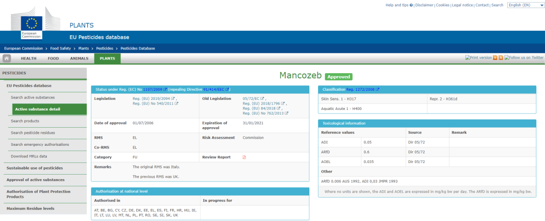 但是,近期,欧盟植物、动物、食品和饲料常设委员会于2020年3月23日和24日举行会议,商讨是否继续授权使用代森锰锌。包括绿色和平组织、地球之友、Hogar sin Toxicos、生态学家在行动、Alborada基金会和Fodesam在内的组织要求政府投票禁止此种产品,以支持欧洲农药行动网(PAN Europe)发起的运动。他们认为:“根据欧盟指令1107/2009附件二第3.6.4条,代森锰锌属于生殖毒性农药,仅这一项即可予以禁用。欧盟在2006年批准了代森锰锌的广泛用途,但当时依据的数据并不充分。欧盟委员会本应在2016年对这一批准进行审查,却以工作量太大为由未予实施,因而产品的授权得以延长。最近一次延长产品授权是在2019年,当时欧洲议会对此提出了异议。”