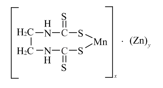 代森类产品是一组分子中含有乙撑双二硫代氨基甲酸盐(或酯)结构(简称“EBDC”)的杀菌剂,拥有近80年的发展历史。代森锰锌(mancozeb),化学名称乙撑双二硫代氨基甲酸锰和锌的络盐,CAS号8010-01-7,分子式 (C4H6MnN2S4)xZny,相对分子质量(265.24)x+(65.38)y,分子结构如下。