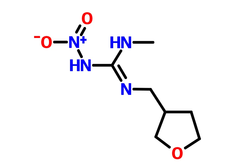 呋虫胺是由日本三井化学研发的第三代烟碱类杀虫剂,作用于昆虫神经传递系统,使其异常兴奋,麻痹死亡,具有触杀、胃毒作用。与传统的新烟碱类杀虫剂相比,呋虫胺的水溶性更强,这意味着呋虫胺更容易被吸收;对蜜蜂的经口毒性只有噻虫嗪的1/4.6,接触毒性是噻虫嗪的一半。可见呋虫胺的性能更为优异。呋虫胺分子式如下图所示: