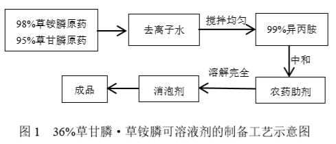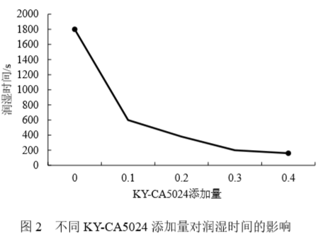 在36%草甘膦·草铵膦可溶液剂其他成分都不变的情况下,对助剂KY-CA5024的不同添加量进行了筛选,其添加量分别设定为10%、20%、30%、40%;以不加KY-CA5024和其他成分都相同的样品为对照处理,对各处理的样品的湿润时间进行了测定,结果见图2。由图2可知,KY-CA5024添加量为40%时36%草甘膦·草铵膦可溶液剂的润湿性最好,明显优于其他添加量的制剂样品和对照。36%草甘膦·草铵膦可溶液剂的湿润性好,其除草活性会明显增加,所以选择KY-CA5024的用量为40%。