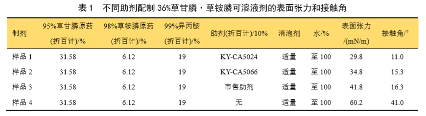 在其他成分不变的情况下分别添加助剂KY-CA5024、KY-CA5066和市售助剂配制36%草甘膦·草铵膦可溶液剂,然后测定所配制制剂样品的表面张力(表1)和接触角(表1)。由表1可知,农药助剂的加入使36%草甘膦·草铵膦可溶液剂表面张力、液滴的接触角显著降低,其中添加助剂KY-CA5024的样品1表面张力最小,约30 mN/m,接触角也最小。这说明助剂KY-CA5024能显著提高36%草甘膦·草铵膦可溶液剂增溶性、润湿性,能够显著降低表面张力和接触角,是较为理想的助剂。