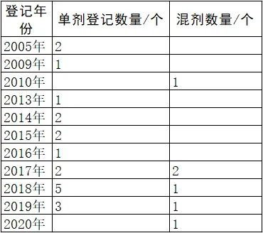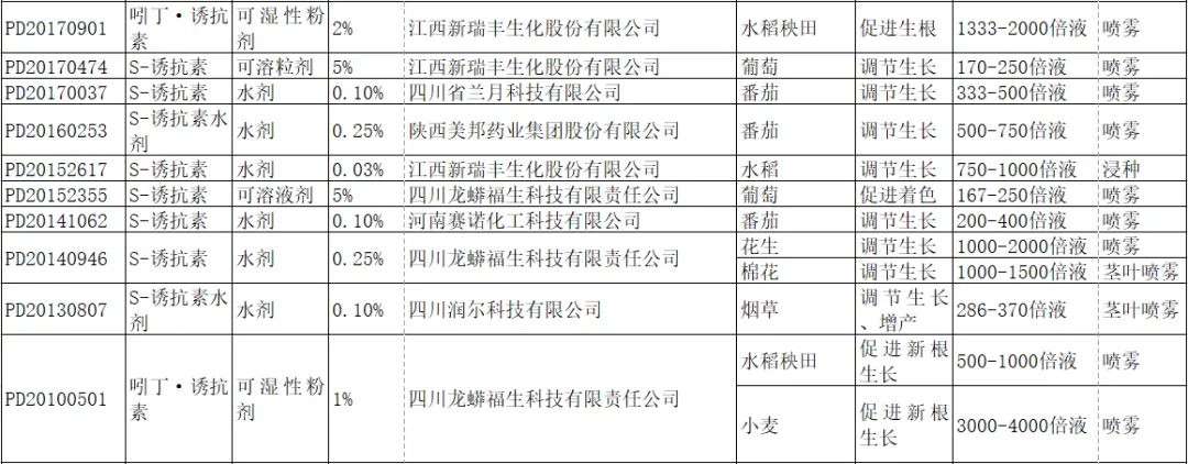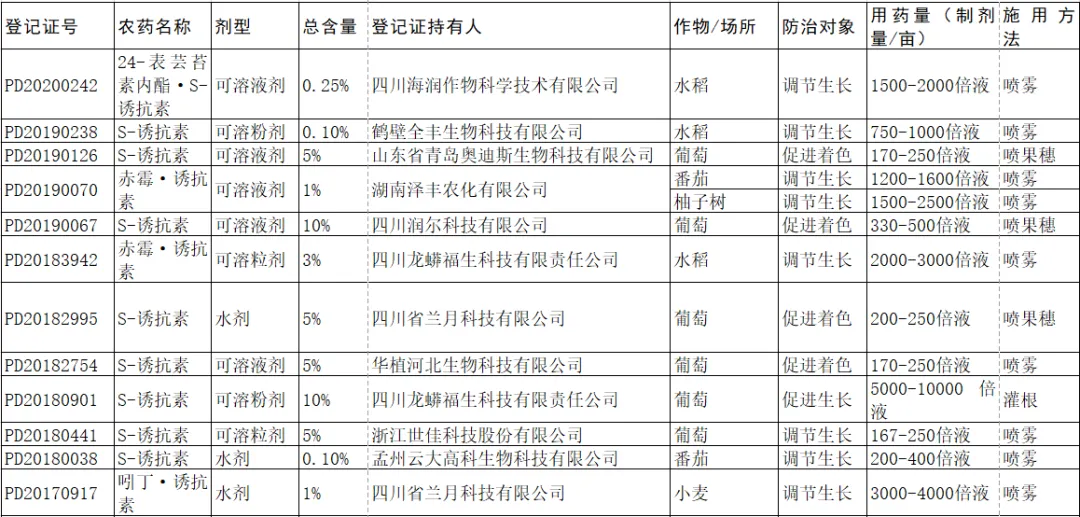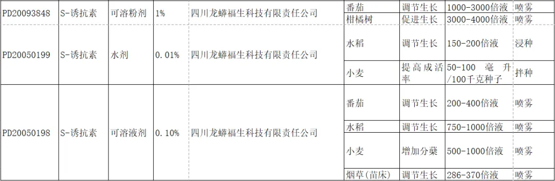 四川龙蟒福生科技有限责任公司2001年在我国首次临时登记S-诱抗素产品,2005年转入正式登记(90%原药和0.006%水剂)。截至2020年10月底,我国共批准28个S-诱抗素产品登记(不包括登记证已过期产品),其中原药3个,制剂25个;微毒13个,低毒15个。