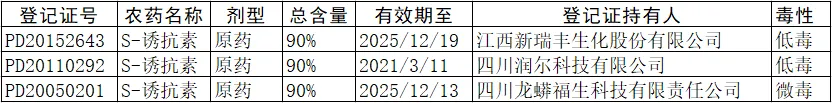 表1 我国登记的S-诱抗素原药产品及登记企业