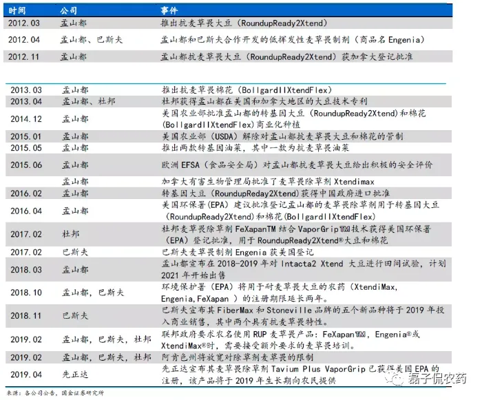 我们可以发现,本次禁用的只是作为转基因作物配套使用的XtendiMax、Engenia、FeXapan三个品牌的麦草畏制剂,而常规使用的麦草畏并没有被禁。但失去了转基因作物这一大块目的市场的麦草畏制剂犹如被西游记中被收去法宝的金角大王,再难以与草甘膦抗衡。