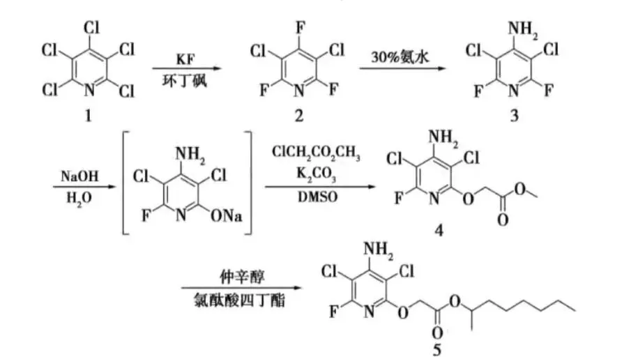 国内工厂的产能集中在山东绿霸、江苏中旗、四川利尔等。氯氟吡氧乙酸异辛酯主要中间体是五氯吡啶,合成路线如图1。