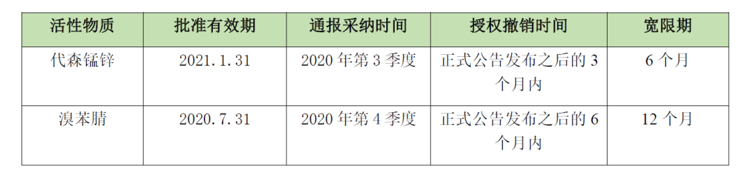 根据欧盟农药法规活性物质批准的要求(参见 (EC) No 1107/2009第4条),含该物质的植物保护产品的使用,不应给人类健康和环境造成不良影响。EC综合考虑评估国和欧洲食品安全局(EFSA)的评估草案以及同行评议的结果,认为该物质批准的条件不再满足,最终提议不再批准代森锰锌和溴苯腈。关于这2种活性物质目前的批准有效期、通报采纳时间、相关制剂授权撤销时间以及库存产品分销和处理的宽限期如下表所示:
