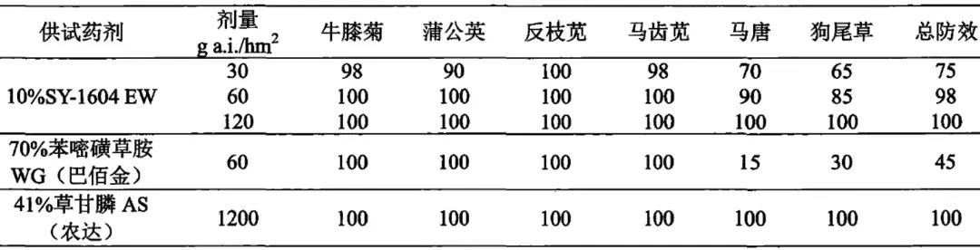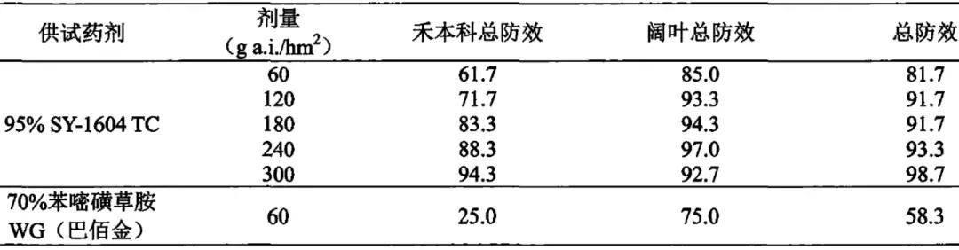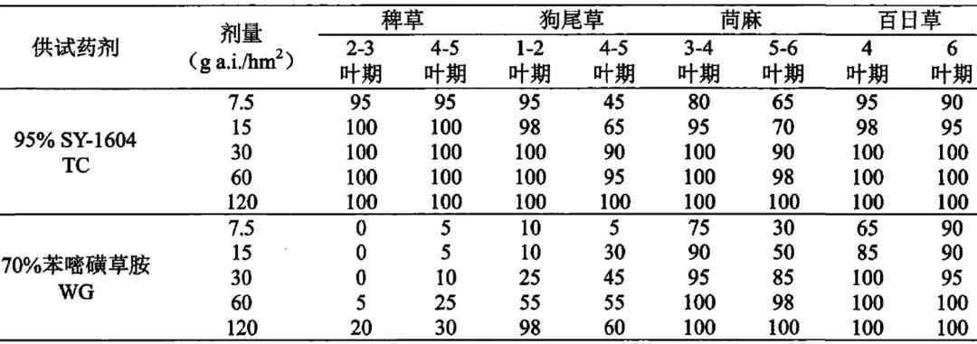 SY-1604室内同等剂量下对阔叶杂草的防效与苯嘧磺草胺相当或略优于,对禾本科杂草活性远优于苯嘧磺草胺(表1)。