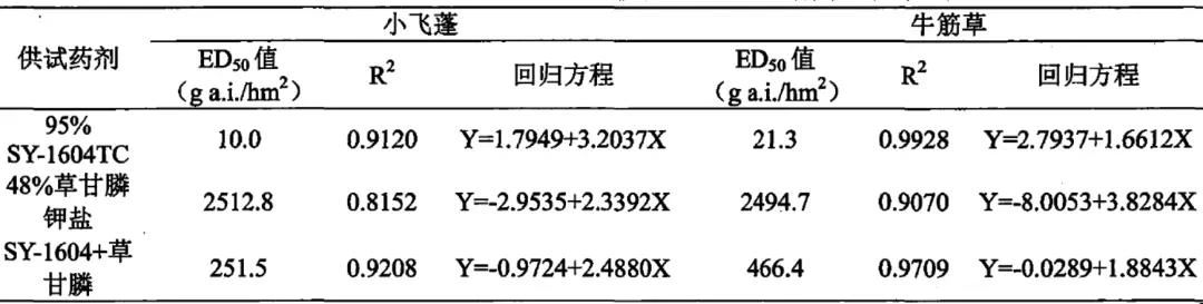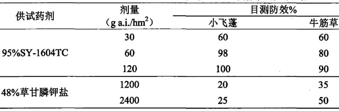 表3 SY-1604、草甘膦对抗性小飞蓬和牛筋草的防效试验