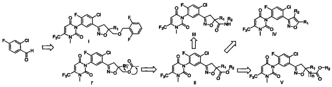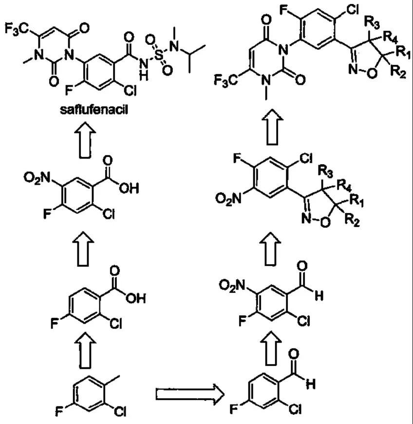 课题组在长期的新农药创制研发过程中,总结出了一种行之有效的新农药创新方法中间体衍生化方法”,包括直接合成法,替换法,衍生法。其本质是从有机合成的角度出发,利用中间体可进行多种反应的特性,把新药创制中先导化合物发明的复杂过程简单化。因为任何一个产品都是由一个或几个原料或中间体经反应而得。分析苯嘧磺草胺的衍生过程,应该是以2-氯-4-氟甲苯为起始原料,经过氧化成酸,硝化、还原、合环成脲嘧啶结构得到。为了获得活性优异并能有效防除抗性杂草的全新结构化合物,本研究同样选用苯嘧磺草胺的初始原料2-氯氟甲苯为起始原料,经过氧化成醛,后经硝化、肟化、成环衍生得到各种不同取代基的异噁唑啉中间体,后经还原、合环成为脲嘧啶结构(图3)。