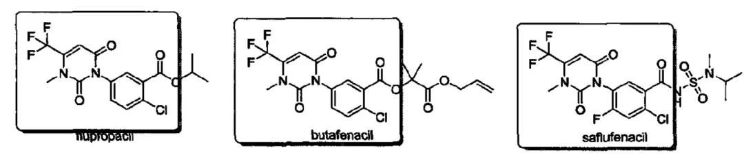 通过查阅大量资料发现,PPO抑制剂类除草剂抗性报道较少,且活性高亦可作为灭生性除草剂使用,其中尤以含有脲嘧啶官能团的活性突出,如图1所示的美国尤尼罗伊尔化学公司开发的flupropacil、先正达公司开发的氟丙嘧草酯(butafenacil)、巴斯夫公司开发的苯嘧磺草胺(saflufenacil)等均具有共同的含有脲嘧啶的苯甲酸骨架。