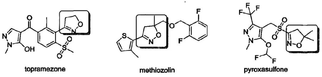近几年新出现的具有异噁唑啉结构的除草剂如图2所示的巴斯夫开发的苯唑草酮(topramezone)、韩国化学技术研究所开发的methiozolin、日本组合化学公司开发的砜吡草唑(pyroxasulfone)和fenoxasulfone均具有典型的异噁唑啉官能团,结构新颖,对禾本科杂草活性优异。