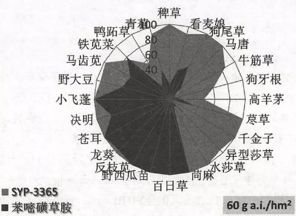 SY-1604的杀草谱明显比苯嘧磺草胺广(图5),且在60 g a.i./hm2时对绝大多数的杂草稗草、狗尾草、异型莎草、水莎草、马唐、荩草、苘麻、百日草、反枝苋、马齿苋、苍耳、龙葵、决明、野西瓜苗以及野大豆防效均高于85%,明显优于苯嘧磺草胺同等剂量下的防效。