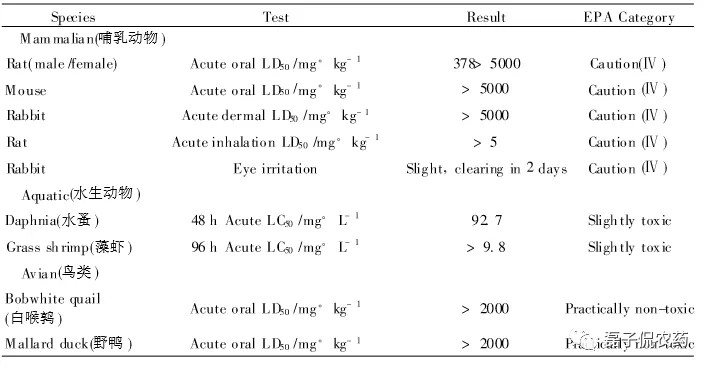 多杀菌素的另一个优点是对哺乳动物和鸟类相对低毒 ,对水生动物也只是轻微的中等毒性,此外,哺乳动物的慢性毒性试验表明 ,多杀菌素无致癌、致畸、致突变性或神经毒性 。下图总结了多杀菌素对哺乳动物、水生动物和鸟类的急性毒性数据。