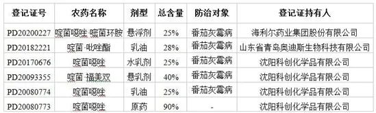 经中国农药信息网查询,截止2020年4月底,国内仅有6个含啶菌噁唑有效成分的产品登记,见表1。