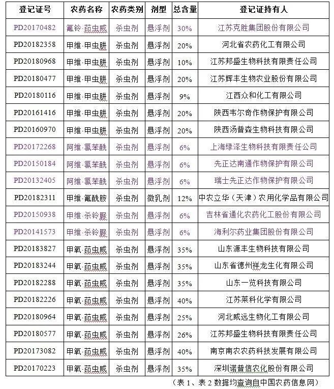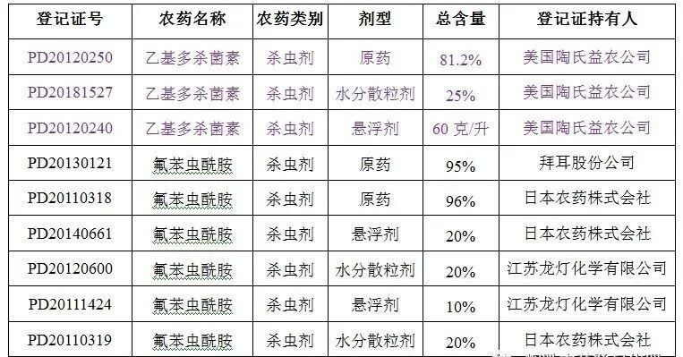 玉米草地贪夜蛾主要危害作物为玉米,同时,在甘蔗、香蕉、花生、大麦、小麦、马铃薯、油菜、辣椒、白菜、甘蓝等多种重要粮食作物和经济作物上均发现其踪迹。今年的草地贪夜蛾虫源基数大,北迁的时间要提早,预计是一个重发生的态势。据估计,2020年全国需要防治草地贪夜蛾面积0.8亿~1亿亩次。日前,农业农村部印发《2020年全国草地贪夜蛾防控预案》,优化调整草地贪夜蛾应急防治用药,推荐最新应急防治药剂28种。据世界农化网报告:“相比于农业农村部在2019年6月5日推荐的25种应急防治药剂,此次推荐用药去掉高效氯氟氰菊酯、氟氯氰菊酯、甲氰菊酯、溴氰菊酯、乙酰甲胺磷5种单剂,增加乙基多杀菌素、氟苯虫酰胺2种单剂和氟铃脲·茚虫威、甲维盐·甲氧虫酰肼、氯虫苯甲酰胺·阿维菌素、甲维盐·杀铃脲、氟苯虫酰胺·甲维盐、甲氧虫酰肼·茚虫威6种复配制剂”。本次,我们就一起来看一下这8种药剂的国内登记情况。