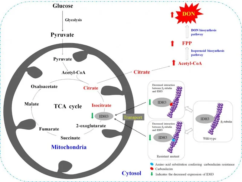 这些研究发现多菌灵防治小麦赤霉病及赤霉病菌发生抗药性变异能够大幅度提高DON毒素生物合成和致病力,而测定的5种琥珀酸脱氢酶抑制剂(SDHIs)杀菌剂则能显著抑制DON毒素生物合成并降低致病力。首次发现多菌灵与异柠檬酸脱氢酶(IDH3)能够竞争性结合β-微管蛋白,降低IDH活性;β-微管蛋白发生抗药性的单个氨基酸变异也会降低与IDH3亲和性,导致乙酰辅酶A积累,从而上调DON毒素生物合成的分子机制(图2)。该研究成果不仅阐明了我国小麦赤霉病灾变机理,为小麦赤霉病防控技术研发及科学评价具有实际应用价值,而且对于研究细胞分裂、呼吸代谢与生长发育的调控机制也具有重要科学意义。