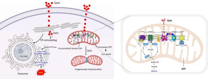 然而,南京农业大学杀菌剂生物学研究团队最近研究发现,QoIs杀菌剂亚致死剂量处理会增强小麦赤霉病菌DON毒素合成能力,提高小麦的毒素污染水平。近日,以青年教师段亚冰副教授为第一作者,周明国教授为通讯作者的《Quinone outside inhibitors affect DON biosynthesis, mitochondrial structure and toxisome formation in Fusarium graminearum》研究论文在国际前沿学术期刊Journal of HazardousMaterials上发表。该研究发现QoIs杀菌剂可上调能量代谢中的乙酰辅酶A生物合成,提供更多的次生代谢物生物合成前体,促进了赤霉病菌DON毒素的生物合成。