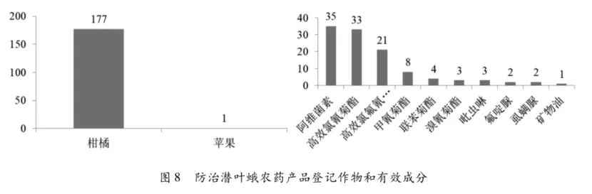 7. 潜叶蛾 防治潜叶蛾农药登记产品179个,登记作物有柑橘和苹果两种作物,有效成分包括阿维菌素、高效氯氰菊酯、高效氯氟氰菊酯、甲氰菊酯、联苯菊酯、吡虫啉、氟啶脲、虱螨脲、矿物油等。
