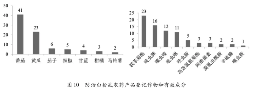 9. 白粉虱 防治白粉虱农药登记产品78个,登记作物有番茄、黄瓜、茄子、辣椒、甘蓝、柑橘、马铃薯等作物,有效成分包括联苯菊酯、啶虫脒、噻虫嗪、吡虫啉、呋虫胺、高效氯氰菊酯、阿维菌素、溴氰虫酰胺、辛硫磷、噻虫胺等。