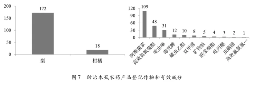 6. 木虱 防治木虱农药登记产品189个,登记作物有梨和柑橘2 种作物,有效成分包括阿维菌素、高效氯氰菊酯、吡虫啉、毒死蜱、螺虫乙酯、双甲脒、矿物油、联苯菊酯、吡丙醚、虫螨腈、高效氟氯氰菊酯等。