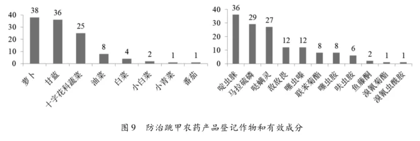 8. 跳甲 防治跳甲农药登记产品121个,登记作物有萝卜、甘蓝、十字花科蔬菜、油菜、白菜、小白菜、小青菜、番茄等作物,有效成分包括啶虫脒、马拉硫磷、哒螨灵、敌敌畏、噻虫嗪、联苯菊酯、噻虫胺、呋虫胺、溴氰菊酯、溴氰虫酰胺等。