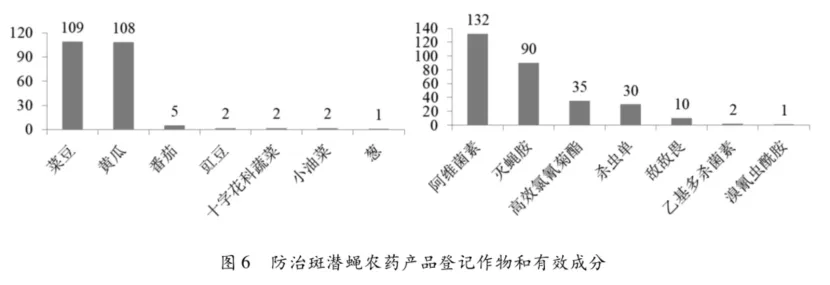 5. 斑潜蝇 防治斑潜蝇农药登记产品222个,登记作物有菜豆、黄瓜、番茄、豇豆、十字花科蔬菜、小油菜、葱等作物,有效成分包括阿维菌素、灭蝇胺、高效氯氰菊酯、杀虫单、敌敌畏、乙基多杀菌素、溴氰虫酰胺等。