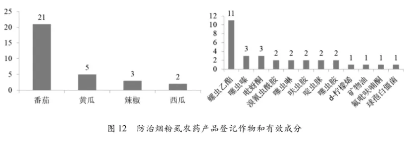 11. 烟粉虱 防治烟粉虱农药登记产品32个,登记作物有番茄、辣椒、黄瓜、茄子、甘蓝、十字花科蔬菜、柑橘等作物,有效成分包括螺虫乙酯、噻虫嗪、溴氰虫酰胺、噻虫啉、呋虫胺、吡蚜酮、啶虫脒、噻虫胺、d-柠檬烯、矿物油、氟吡呋喃酮、球孢白僵菌等。